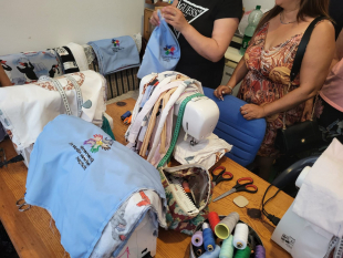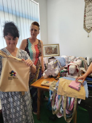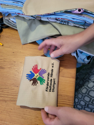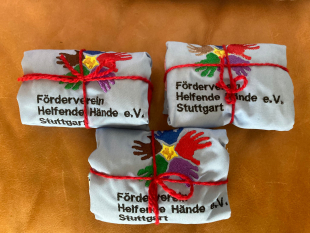 Auch kleine Geschenke wurde ausgetauscht. Die Frauen vor Ort nähten 250 Stofftaschen mit dem Logo des Fördervereins Helfende Hände Stuttgart. Diese handgefertigten Taschen fanden großen Anklang und werden seither gerne zum Verteilen von Geschenken genutzt.